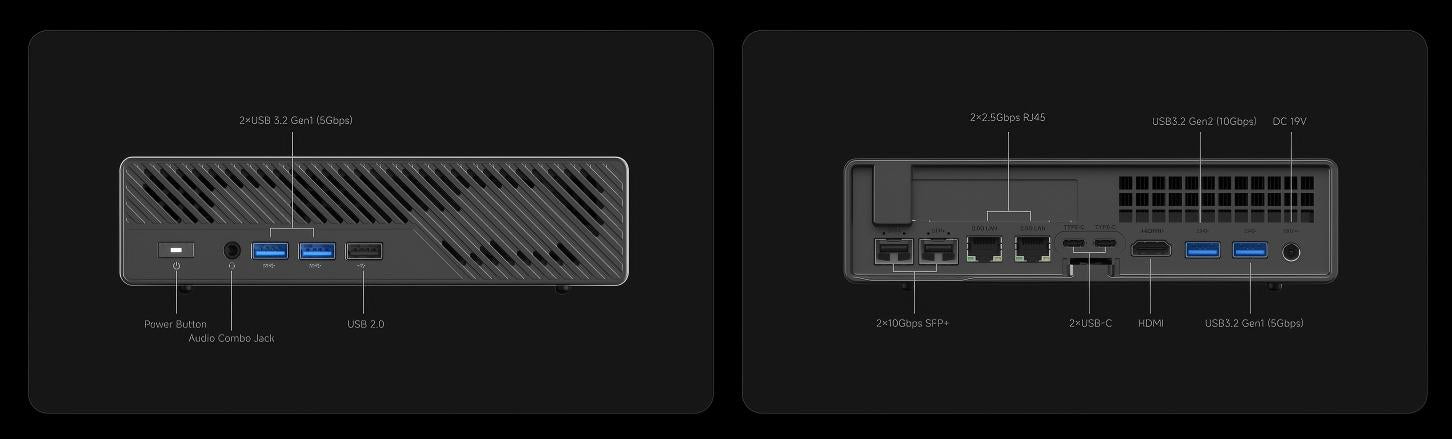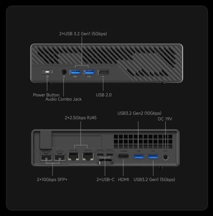 Dual 10 GbE SFP+ ports (Intel X710), plus two 2.5 GbE RJ45 ports (one Intel i226‑V and one Realtek RTL8125) — excellent for multi-speed home networks.