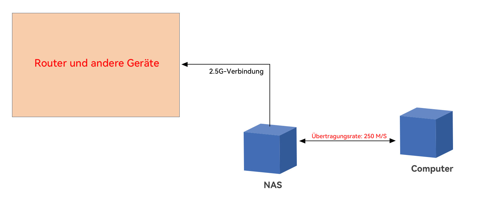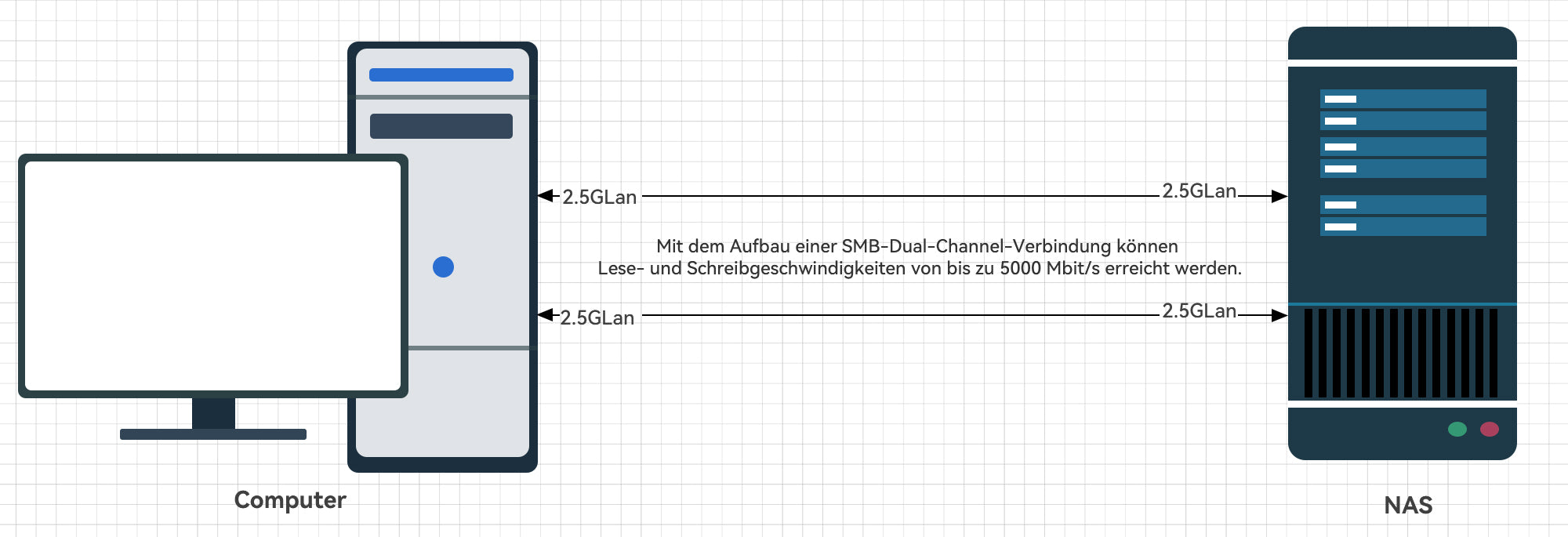 In dem Fall, dass sowohl der Computer als auch das NAS jeweils über zwei 2,5G-Netzwerkkarten verfügen und Multi-Channel SMB unterstützen, ist es möglich, durch die Verwendung des SMB-Protokolls eine Übertragungsgeschwindigkeit von 5000Mbps zu erreichen. Ebenso kann, wenn beide Geräte jeweils über zwei Gigabit-Netzwerkkarten verfügen, eine Geschwindigkeit von 2000Mbps mit dem SMB-Protokoll erreicht werden.