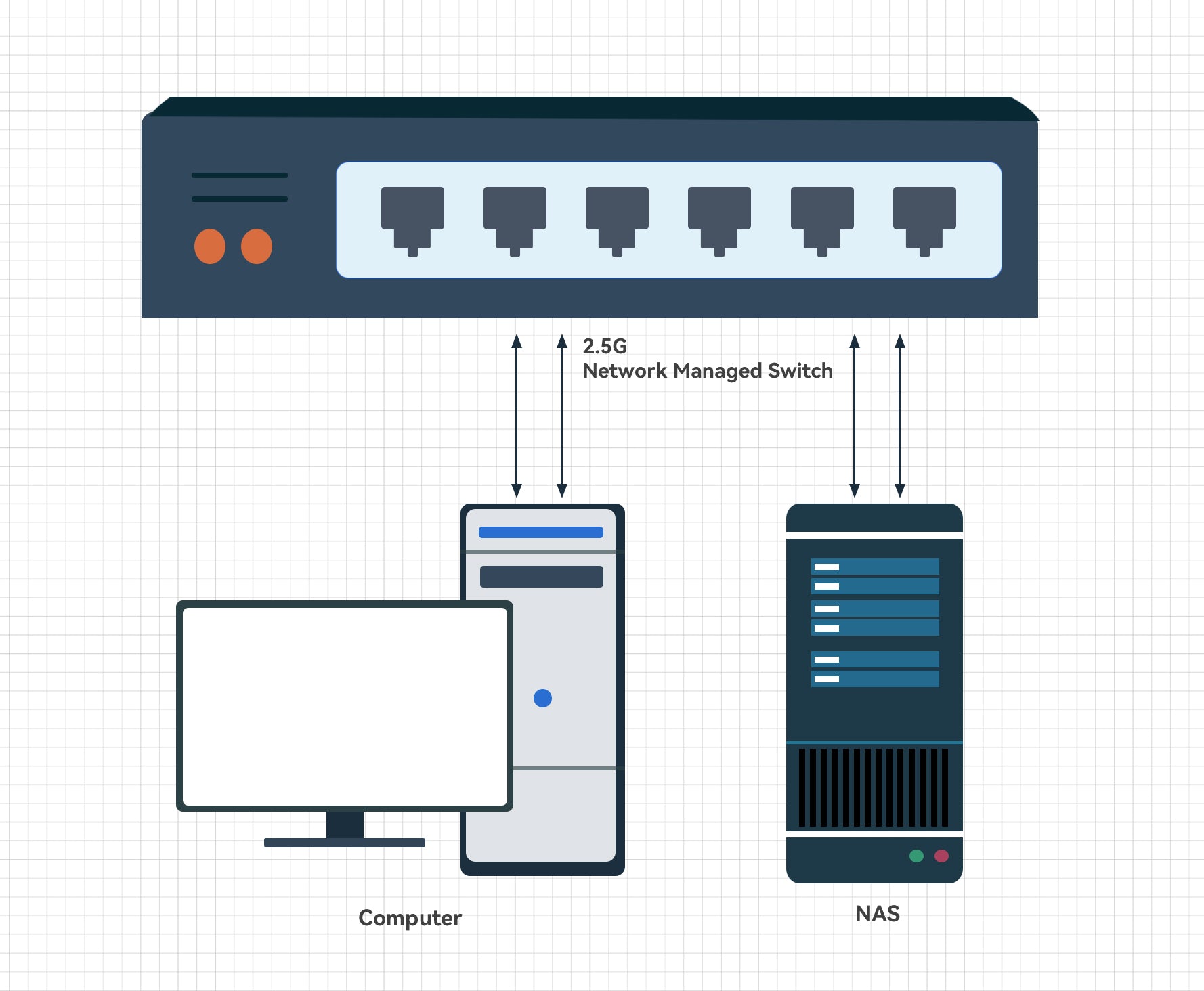 Wenn das NAS jedoch über zwei 2,5G-Ports verfügt und der Computer nur einen 2,5G-Port und einen Gigabit-Port hat, kann kein SMB Multi-Channel hergestellt werden, und die Übertragungsgeschwindigkeit beträgt nur 2500Mbps statt 3500Mbps.