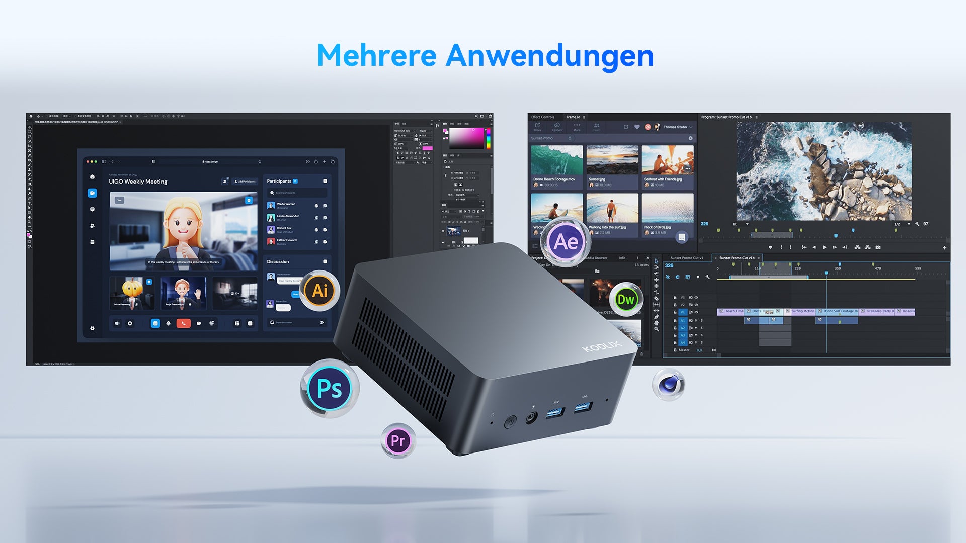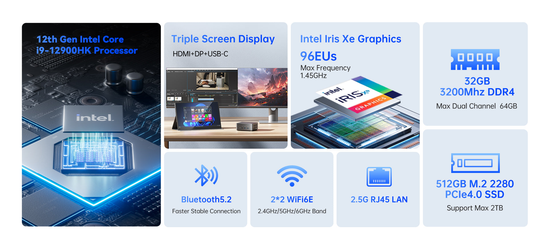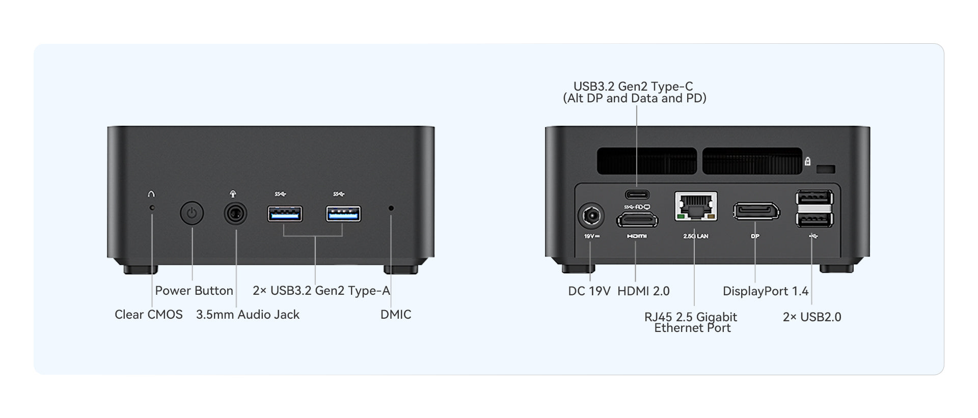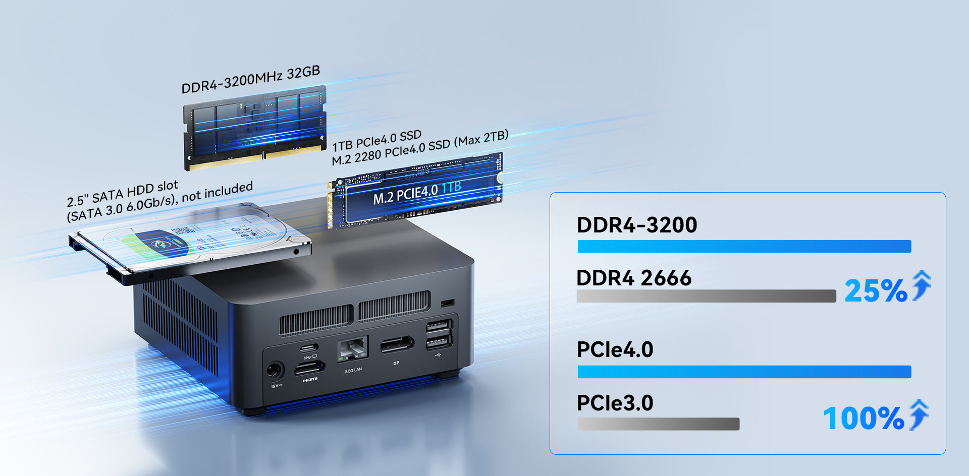 DDR4-Dual-SODIMM-Steckplätze, bis zu 3200MT/s, maximal 64 GB, M.2 2280 PCIe4.0 SSD + 2,5 Zoll SATA HDD (SATA 3.0 6.0Gb/s)