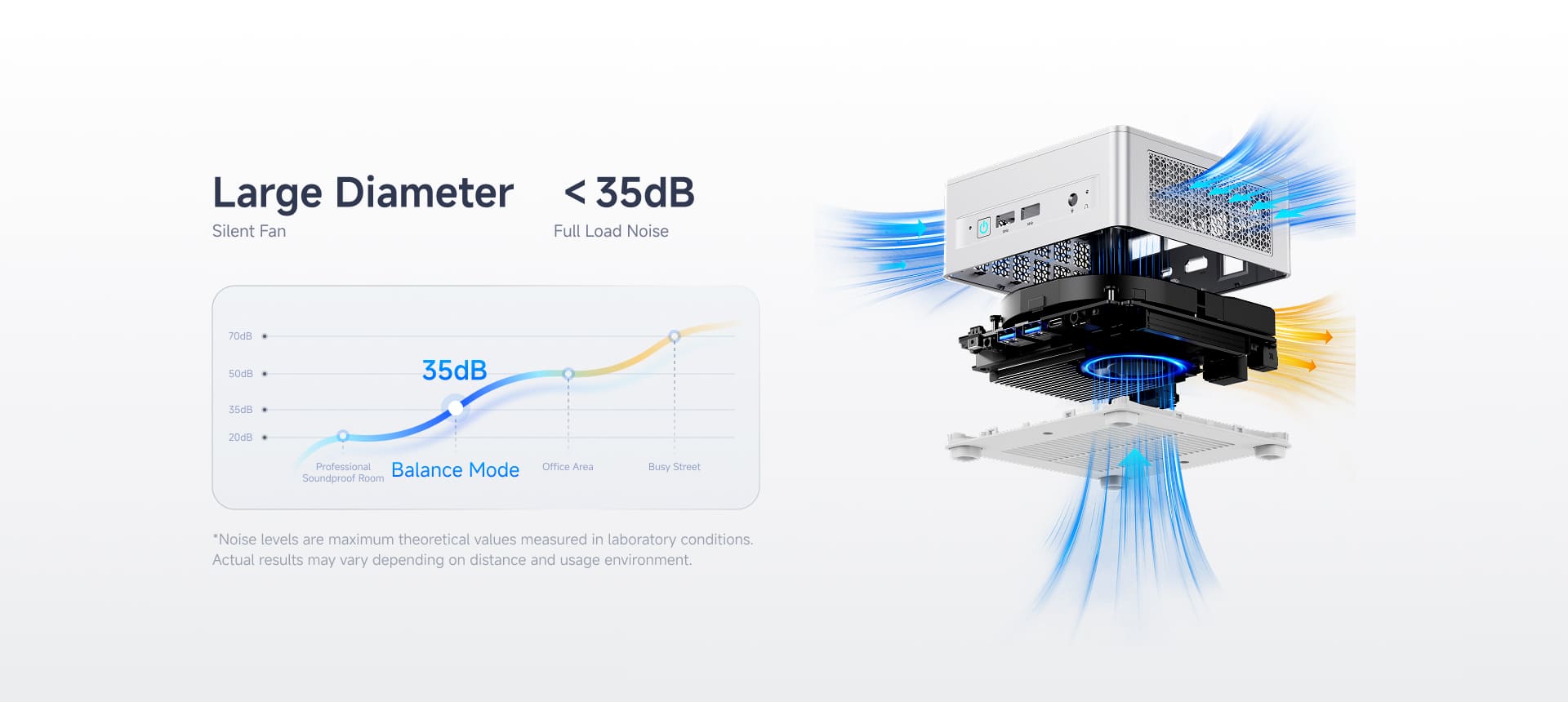 Das System nutzt Kühltechnologie mit Phasenwechselmaterial (PCM) und verfügt über spezielle CPU-Kühler sowie aktive Kühlung für Speicher und Datenträger. Im Vergleich zu Designs mit einem einzigen Lüfter senken sich die Temperaturen um 25 % und verbessern sowohl die Leistung als auch die Lebensdauer des Geräts.