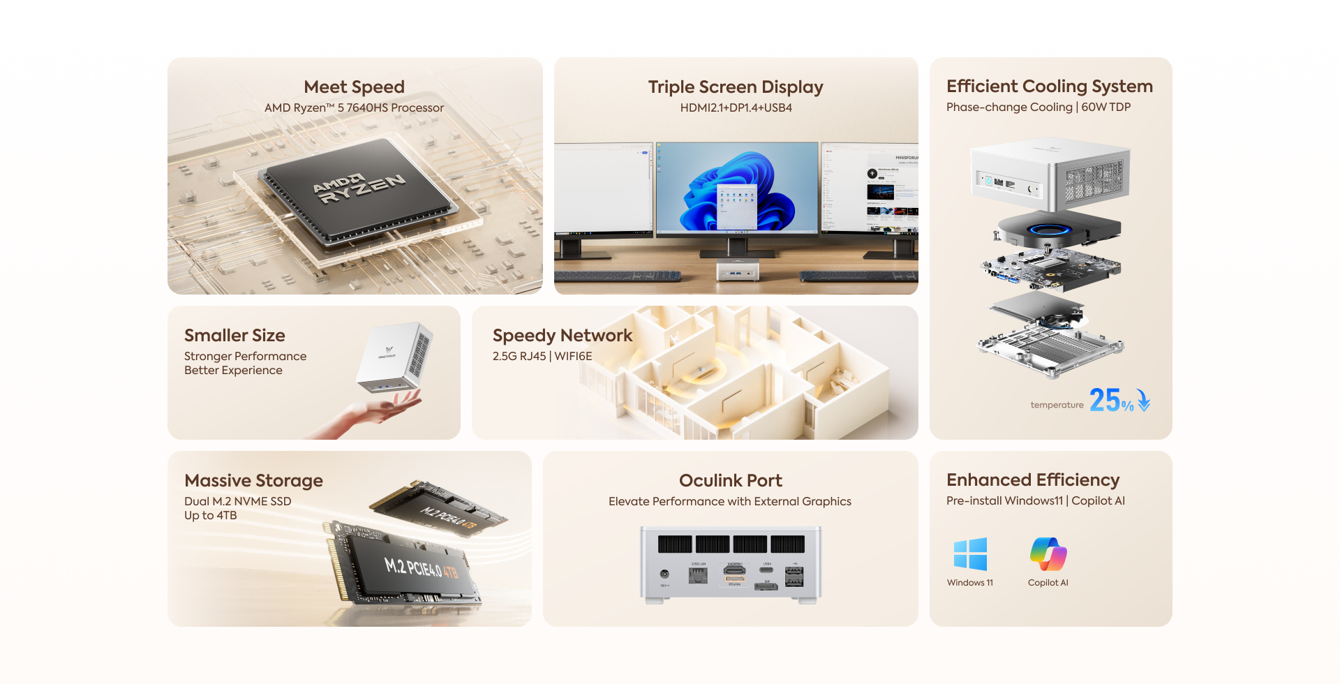 While delivering powerful cooling, the UM760 Plus prioritizes user experience. Even under heavy cooling, noise levels remain below 35dB, ensuring a quiet environment. Whether you're working or relaxing, you can enjoy a peaceful, comfortable atmosphere without distractions.