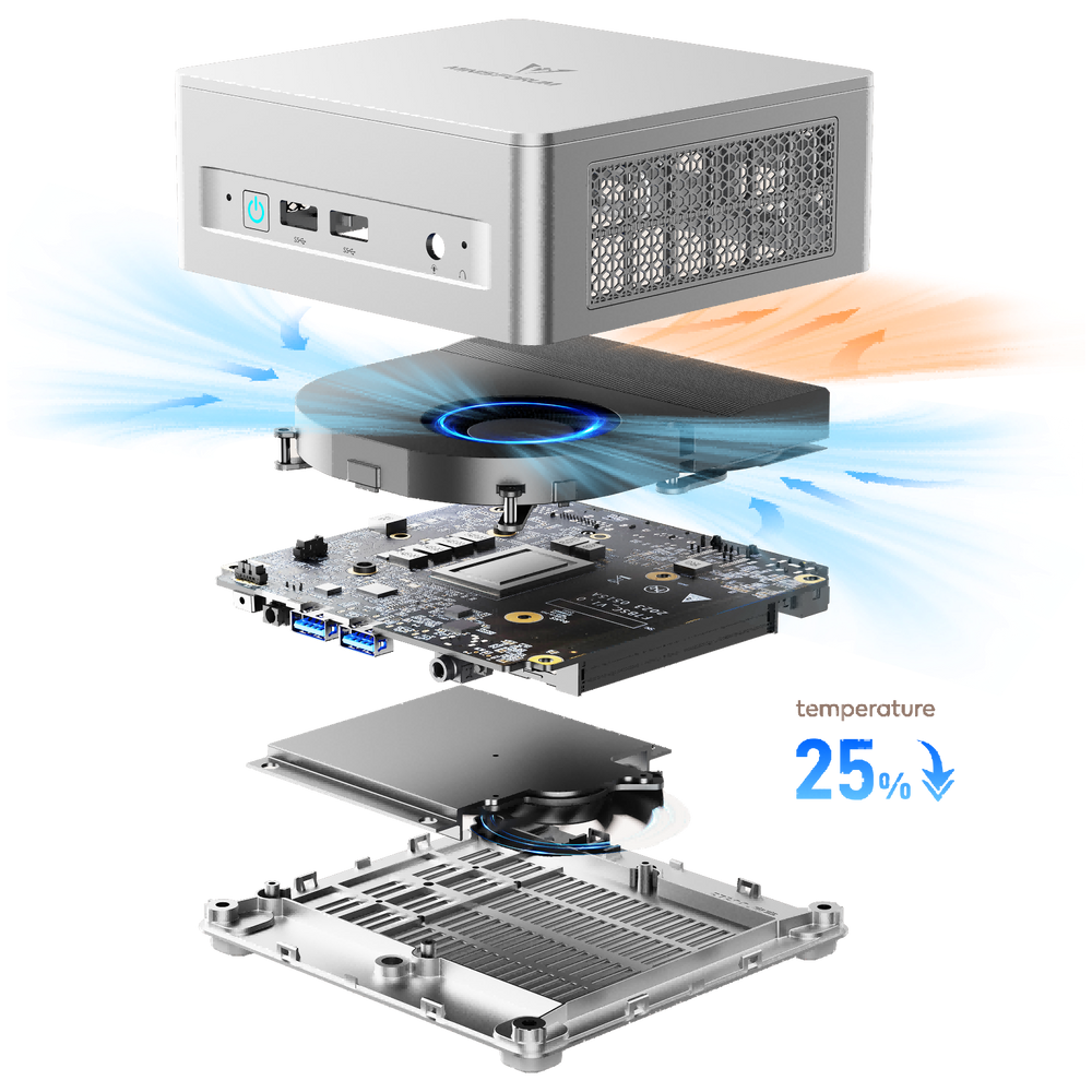 The compact phase-change cooling system uses advanced thermal materials that quickly shift from solid to liquid for efficient heat dissipation. Paired with a large silent fan and three copper heat pipes, it delivers stable 60W performance, keeping your device cool and quiet whether you're working or gaming. The memory and storage also benefit from active cooling, reducing temperatures by 25% for better heat control and extended lifespan.