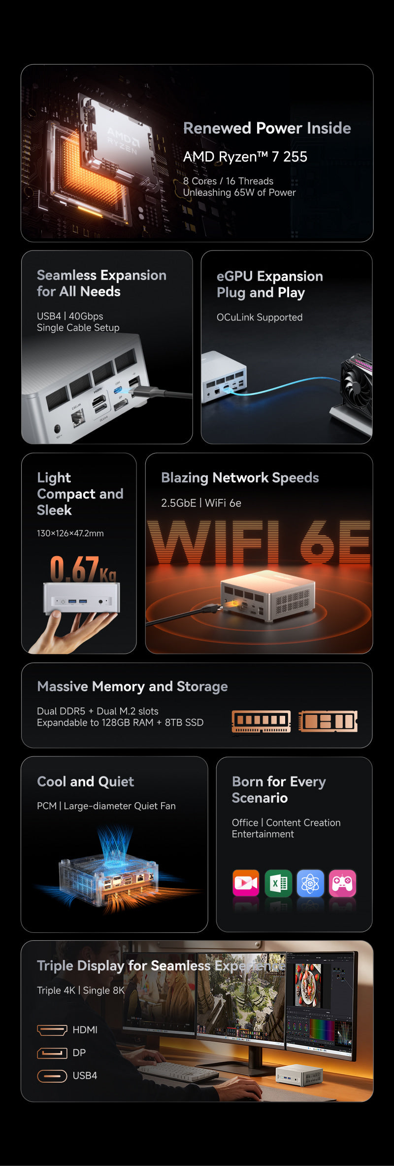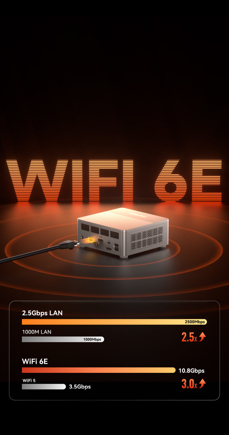 Dual channel DDR5 + Dual M.2 SSD slots, configurable up to 64GB RAM + 1TB SSD, expandable to 128GB RAM + 8TB SSD.