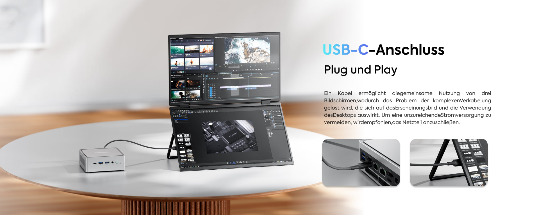 If your laptop has a fully functional USB-C port and a USB-A/HDMI port, use the USB-A to USB-C cable to connect one extension display. Use the USB-C to USB-C cable (provides power) + HDMI to USB-C cable (provides video transmission) to connect the other extension display.