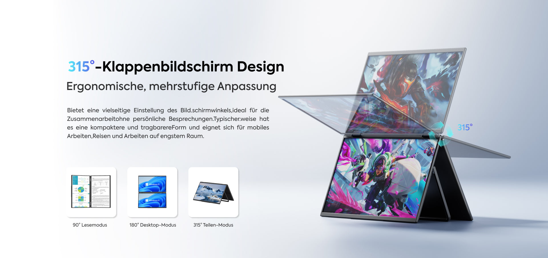The MDSA156 dual monitor is ideal for programmers, designers, students, and frequent travelers. With its high-resolution display and slim, lightweight design, it's easy to take anywhere—at home, in the office, or on the go—and allows you to expand your workspace at any time. Compatible with Windows and macOS systems, it supports 315° rotation and 180° automatic rotation, offering more scenarios and flexibility.