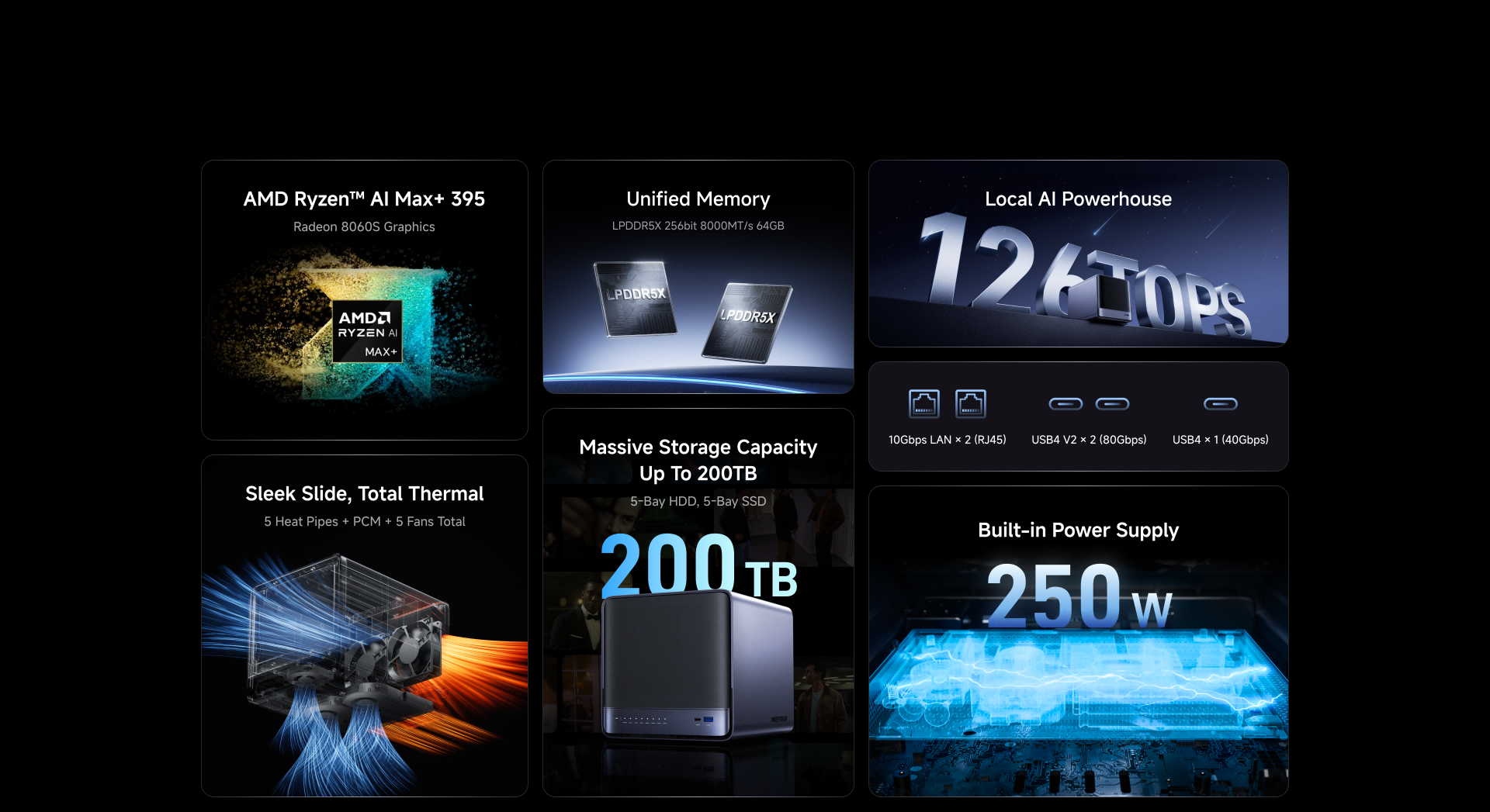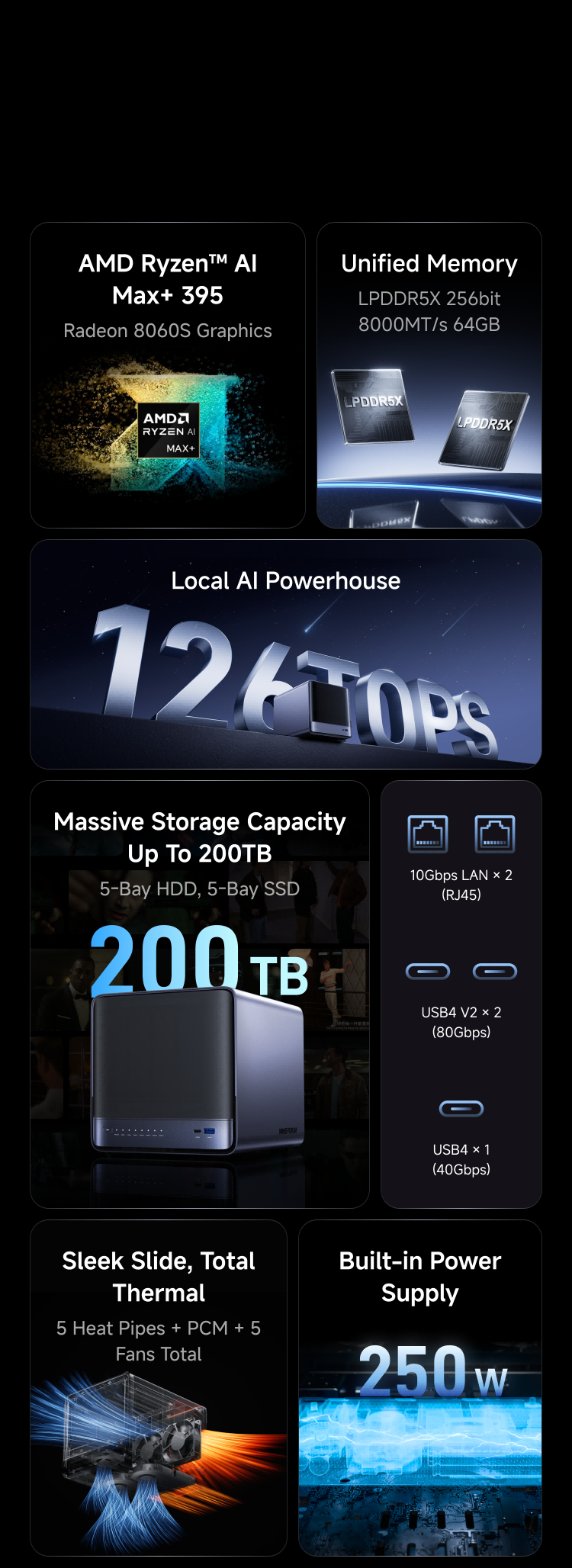AMD Ryzen AI Max+ 395, Radeon™ 8060S, Up To 126 TOPS, And A High-Bandwidth LPDDR5x Architecture Bring Truly Usable High-Performance Local AI Into A 5-Bay AI NAS.