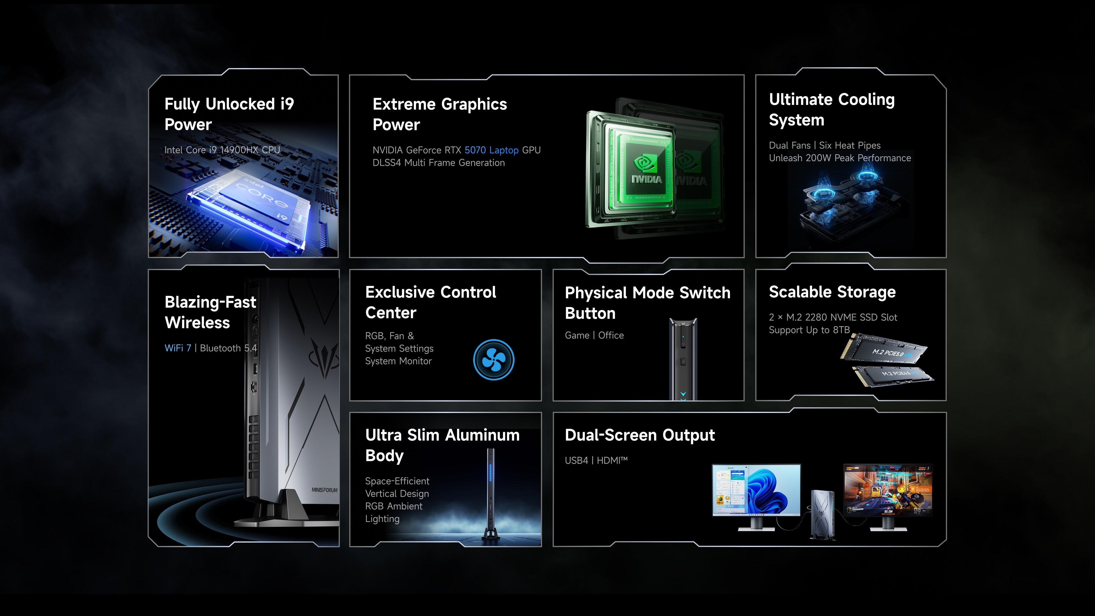 - Noise (Gaming Mode): 26dBA (idle), 32.8dBA (100% load), (50cm), (Minisforum test environment)