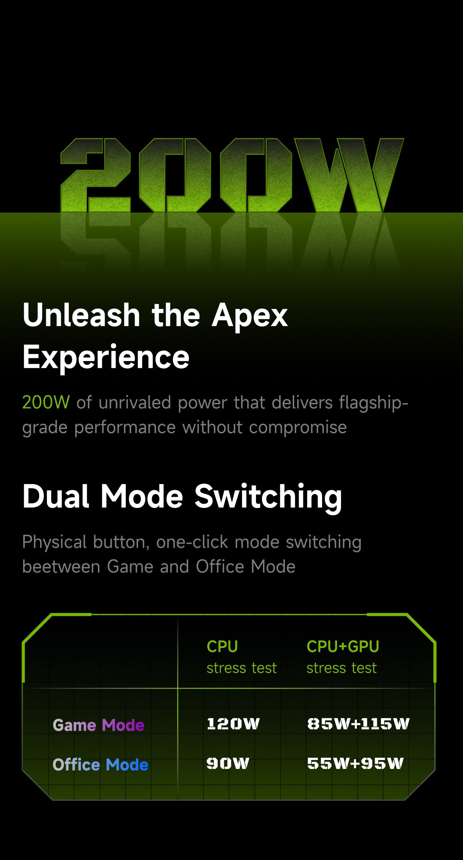 - TDP (Gaming mode): Up to 120W CPU Only / Up to 85W CPU, 115W GPU