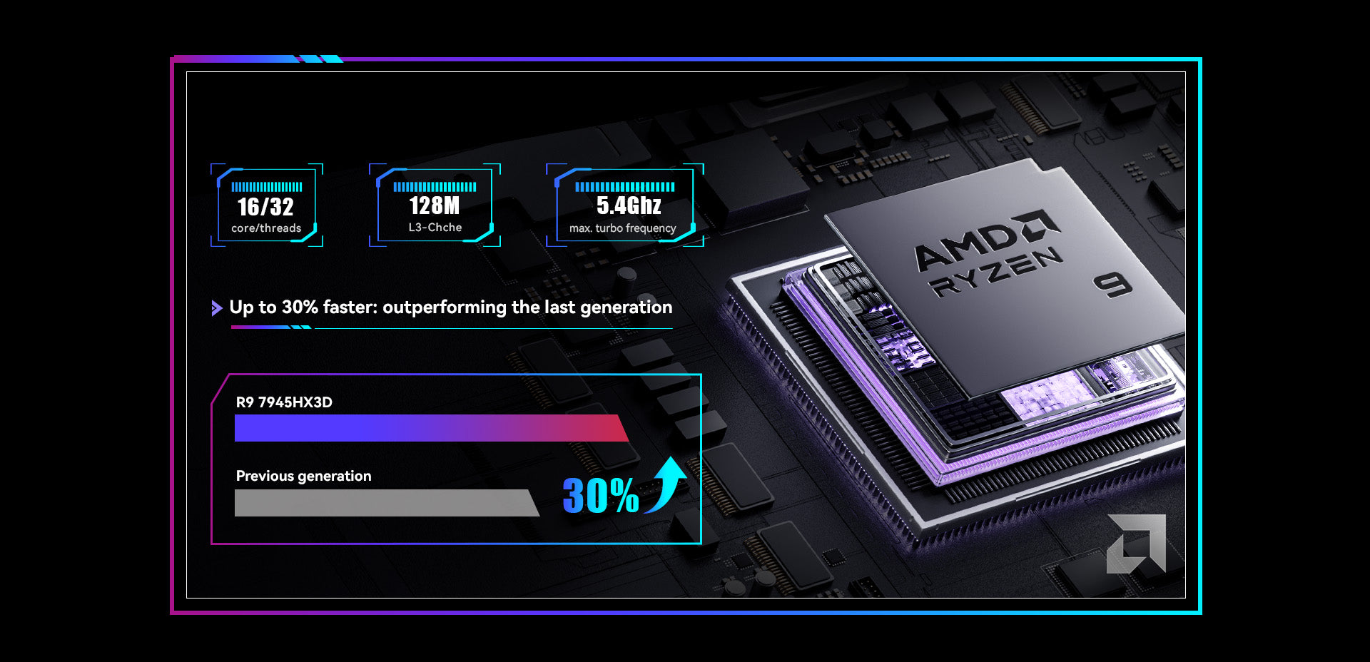 The AMD Ryzen™ 9 7945HX3D processor features Zen 4 architecture with 16 cores and 32 threads. It ensures users can effortlessly handle even the most demanding multitasking scenarios and complete compute-intensive tasks in a flash. The advanced architecture delivers a significant performance boost, making it an ideal choice for gamers, content creators, and professionals who require top-notch computing power.