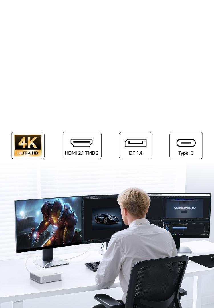 The three heat pipe pure copper thermal architecture reforms heat conduction paths. Innovative turbine fans with aerodynamic vortex grooves boost system airflow by 25%. Advanced phase-change material temperature control technology releasing ultrasmall volume limit performance of mini pc.