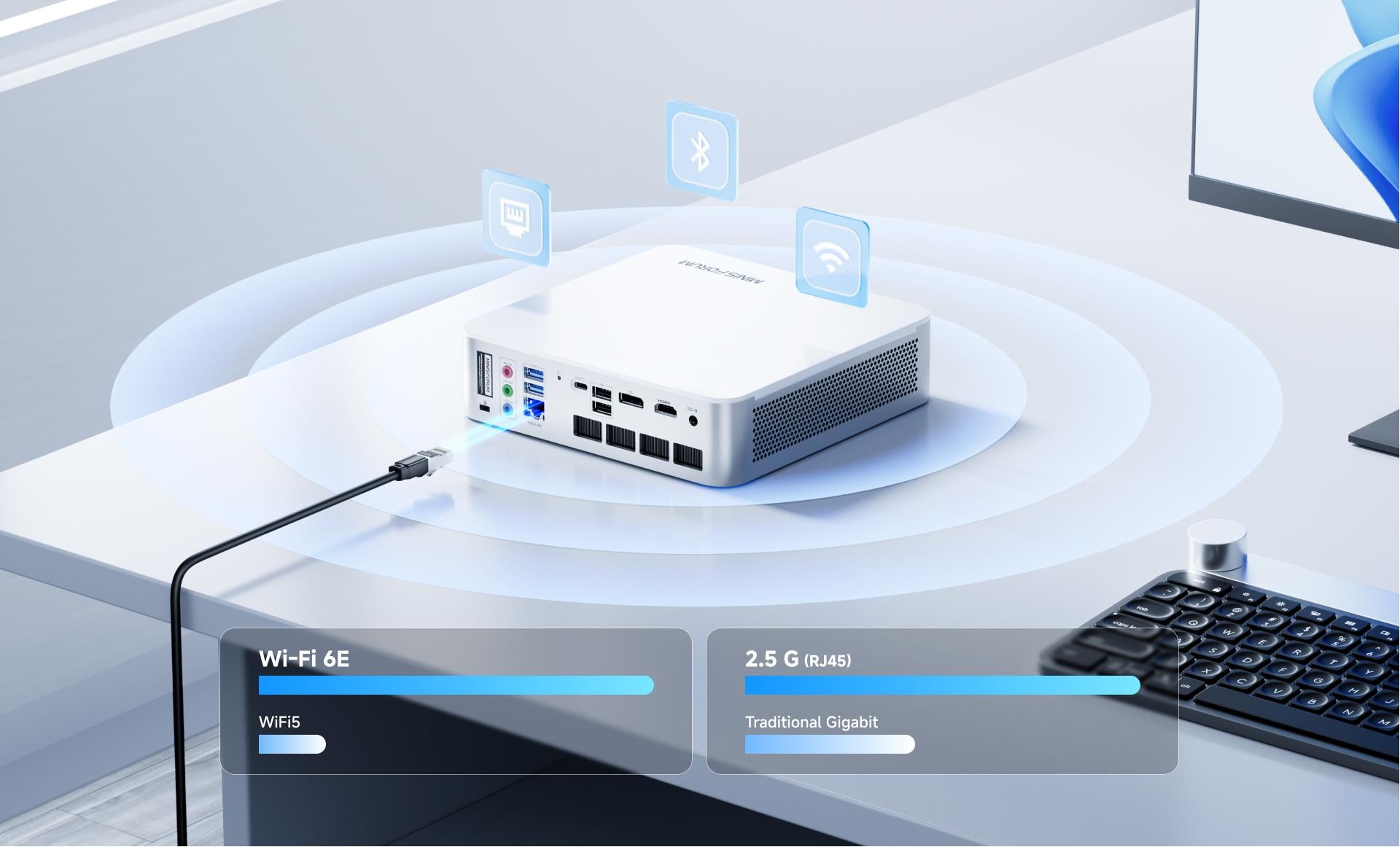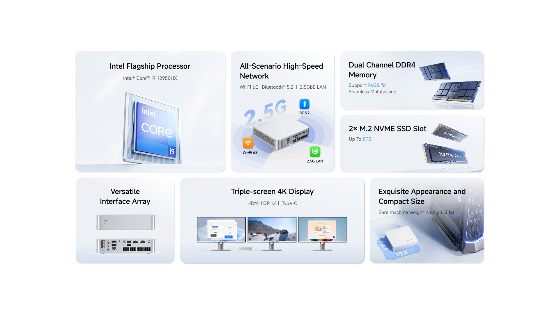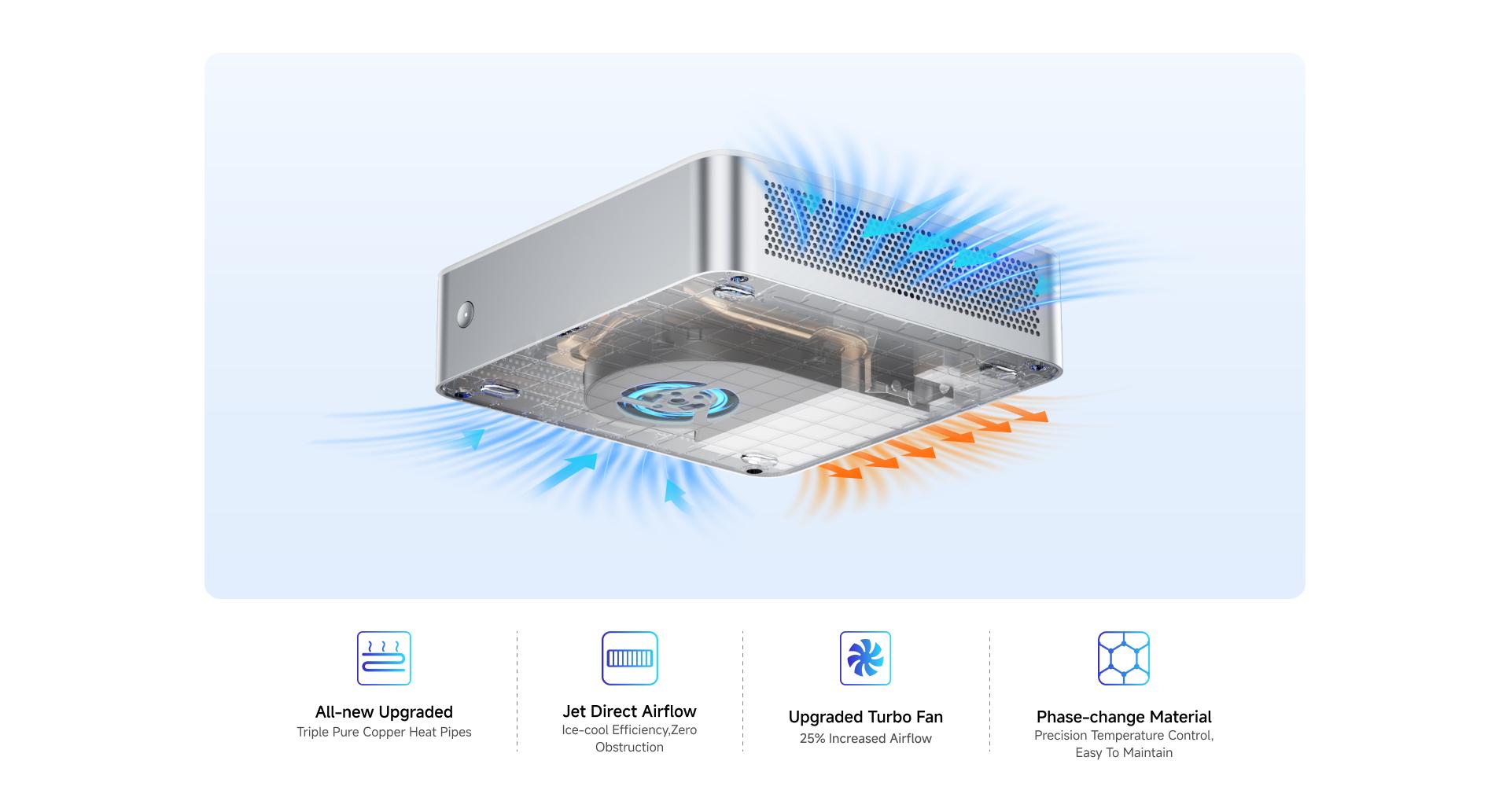 The three heat pipe pure copper thermal architecture reforms heat conduction paths. Innovative turbine fans with aerodynamic vortex grooves boost system airflow by 25%. Advanced phase-change material temperature control technology releasing ultrasmall volume limit performance of mini pc.