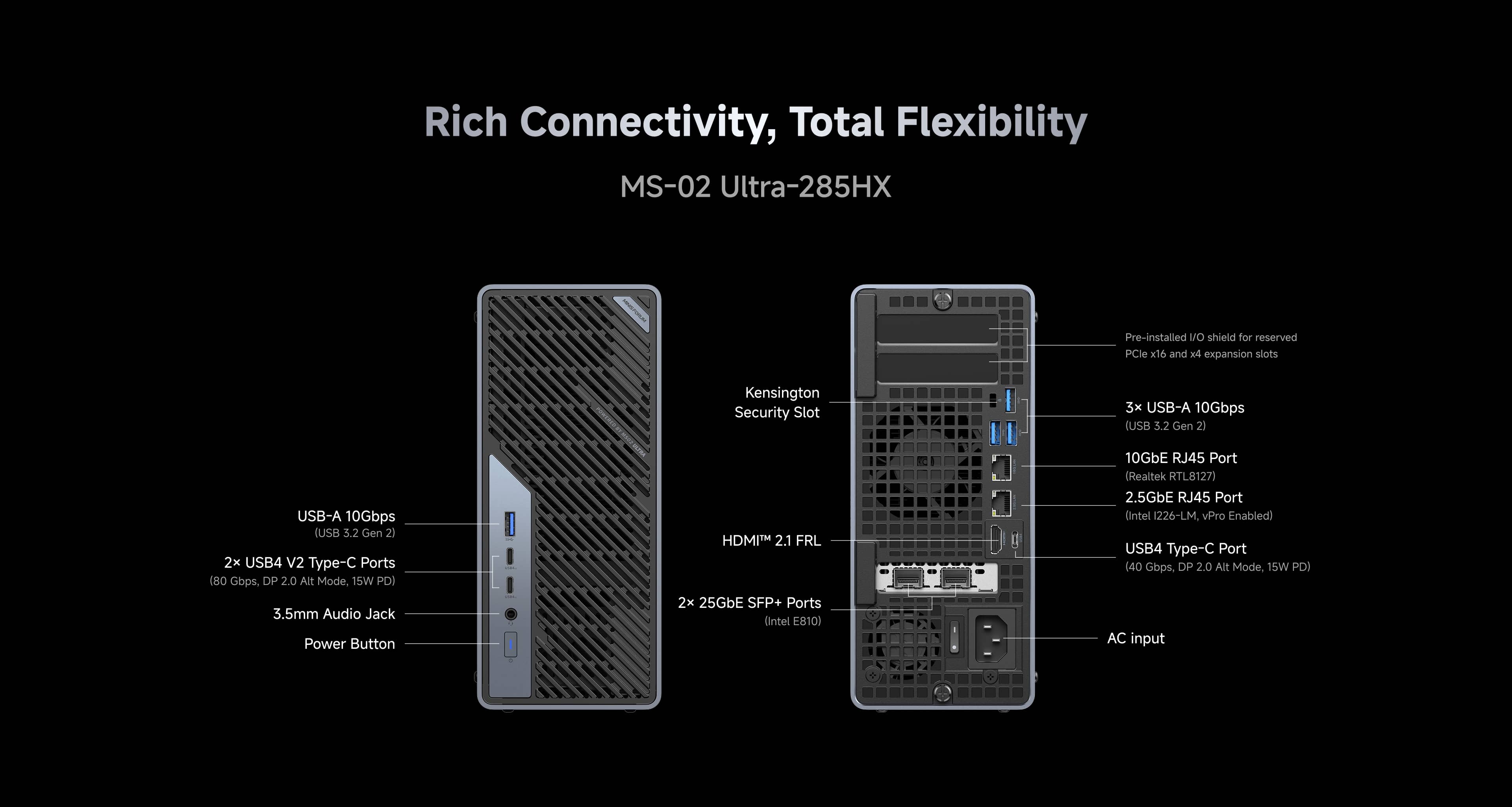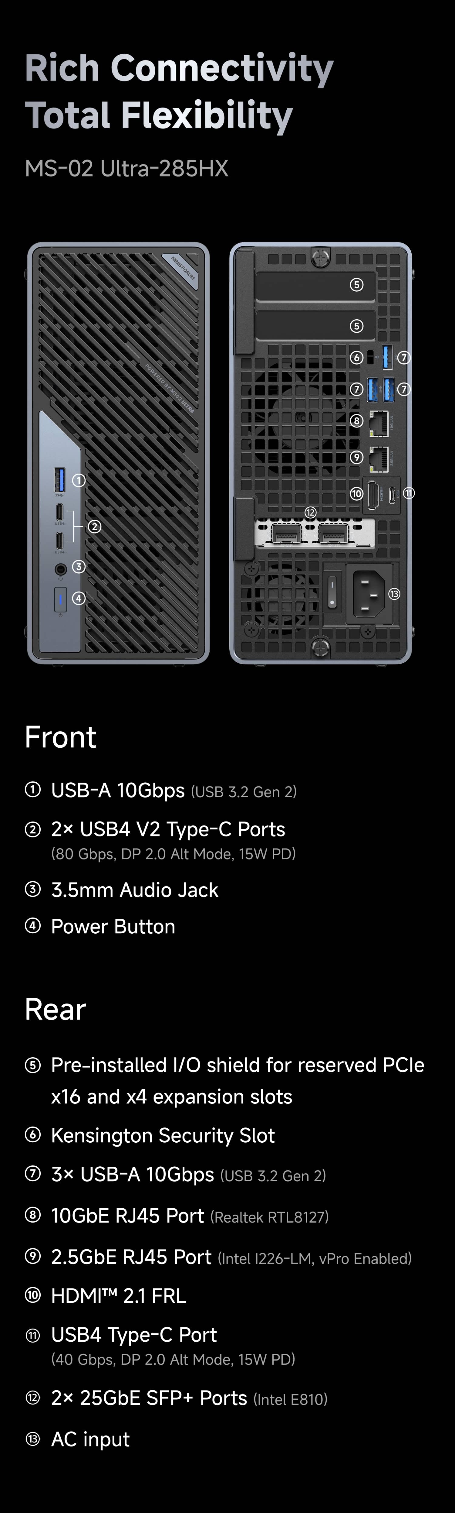 - 2 x USB4 V2 Type-C Ports(80 Gbps, DP 2.0 Alt Mode, 15W PD)