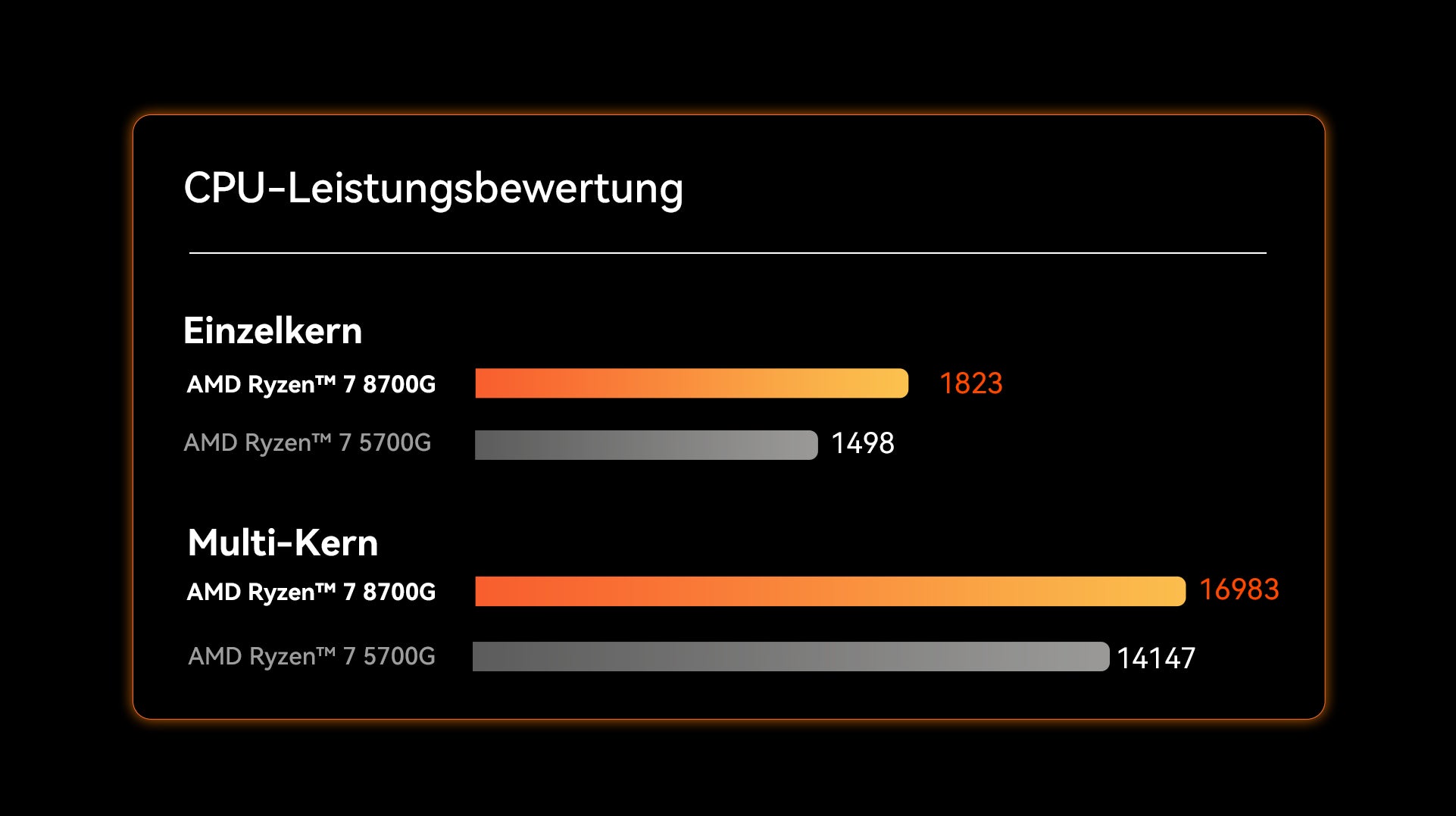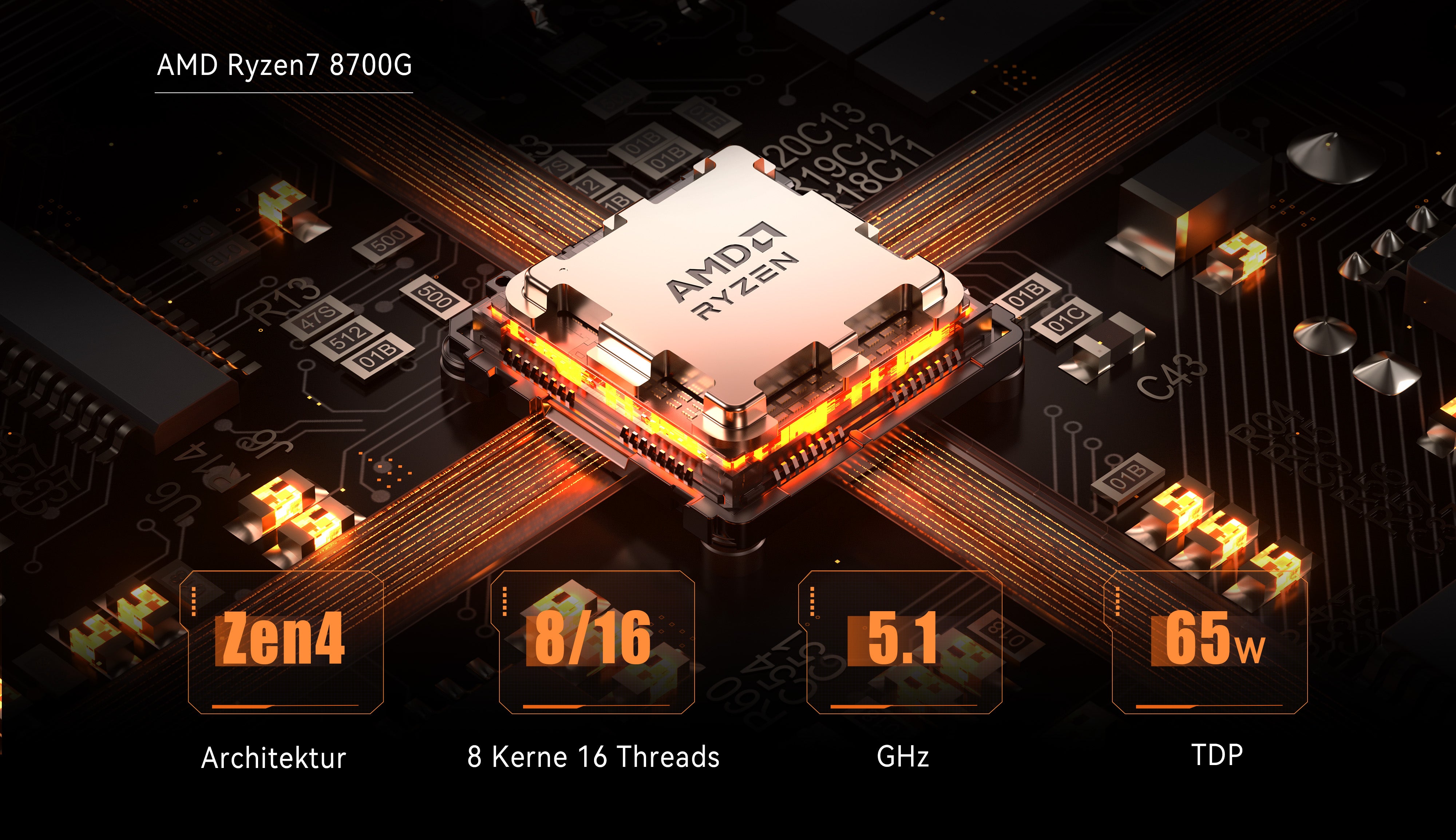 Featuring up to an AMD Ryzen 7 8700G processor and AMD Radeon™ 780M graphics card with 12 GPU cores and a graphics frequency of up to 2900MHz. Built-in independent NPU unit, NPU arithmetic up to 16TOPS, easy to handle various AI tasks.