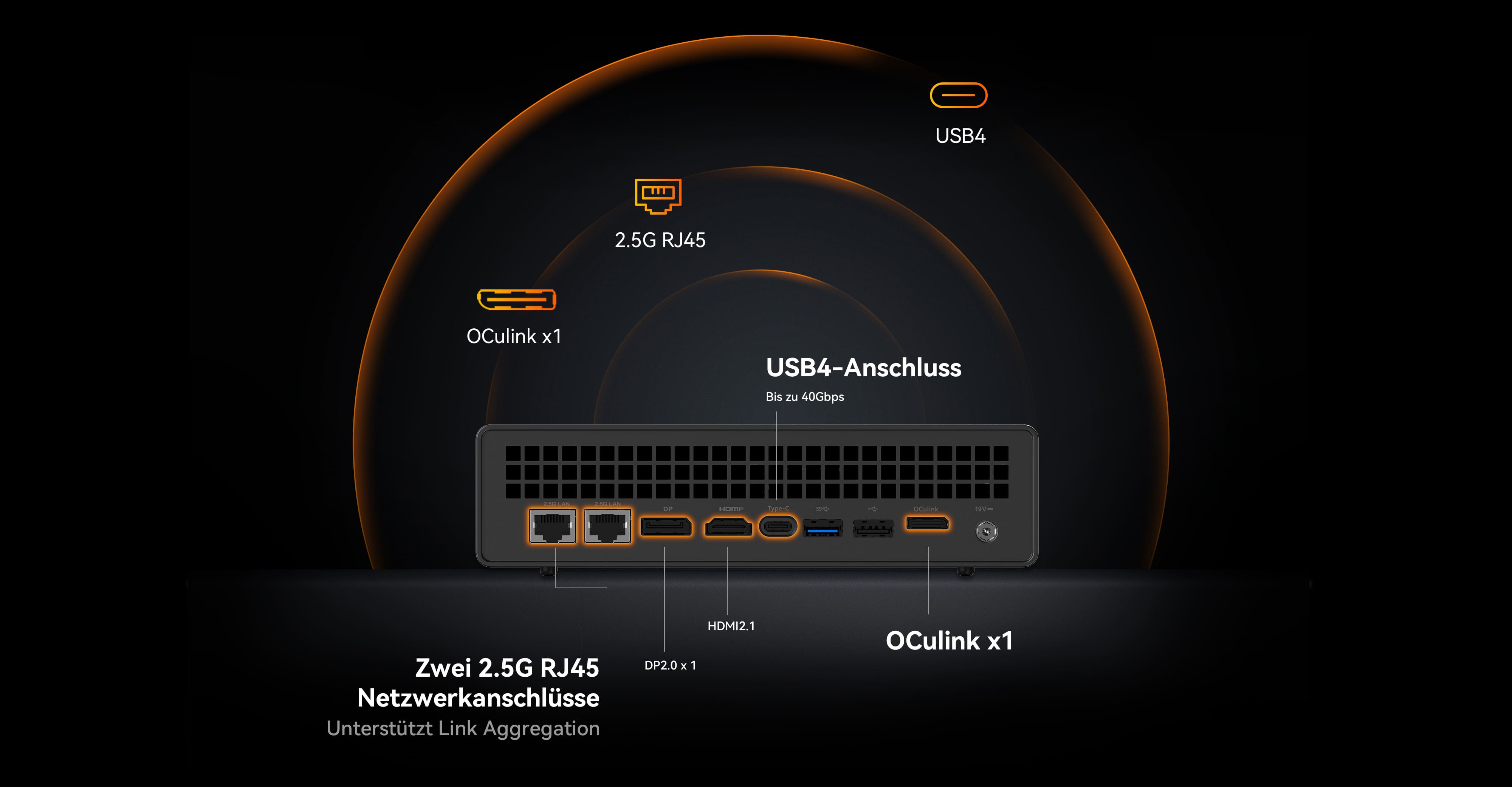 Supports up to 64Gbps transfer bandwidth to easily extend the high performance of external desktop graphics cards and turn a mini PC into a workstation in seconds to meet the computing needs of high-end gaming, professional creation, AI work, etc.
