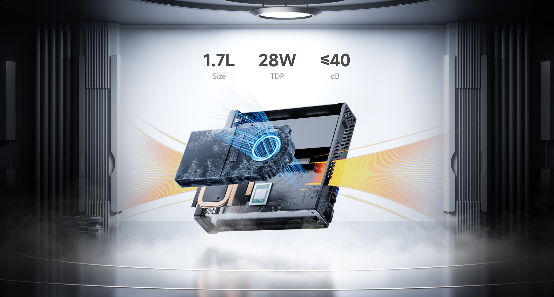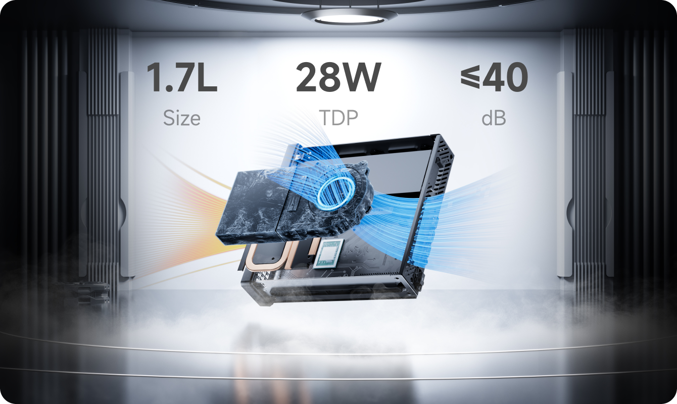 Just 1.7L in size with only 28W TDP, MS-R1 runs under 35dB while delivering workstation-class performance. Its advanced cooling system integrates triple copper heat pipes, a turbine fan, aerodynamic vortex channels, and phase-change thermal materials - precision-engineered for stable power in a compact chassis.