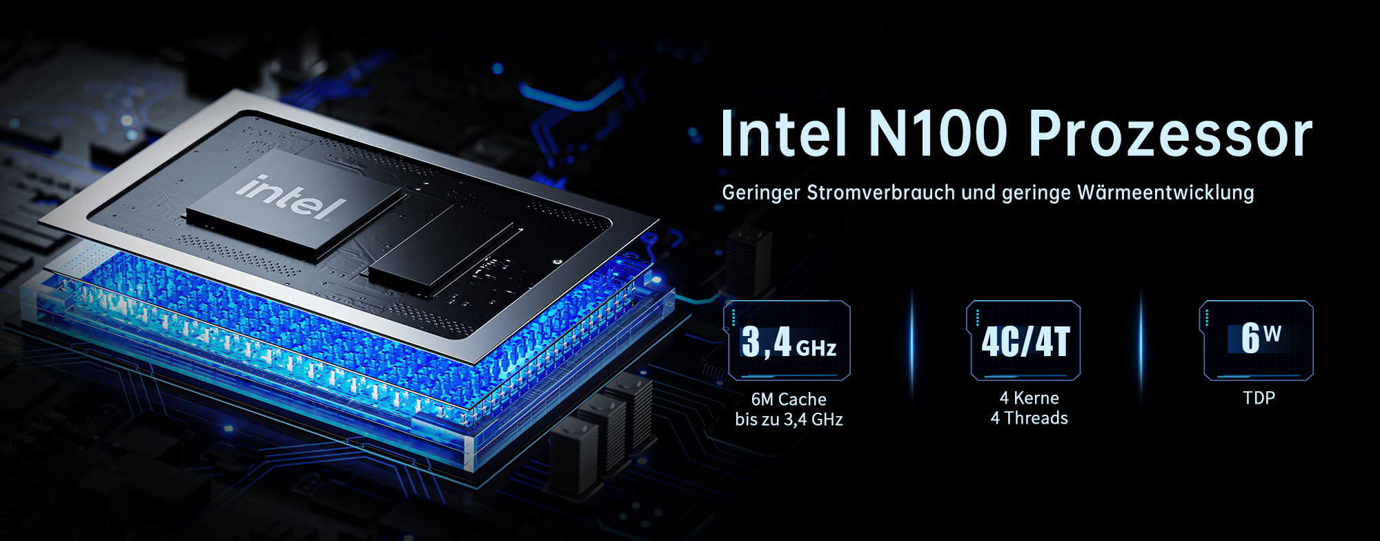 Intel N100-Prozessor, 4 Kerne/4 Threads (6M Cache, bis zu 3,4 GHz)