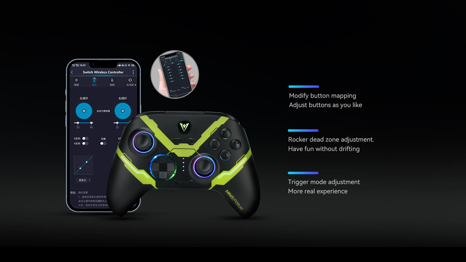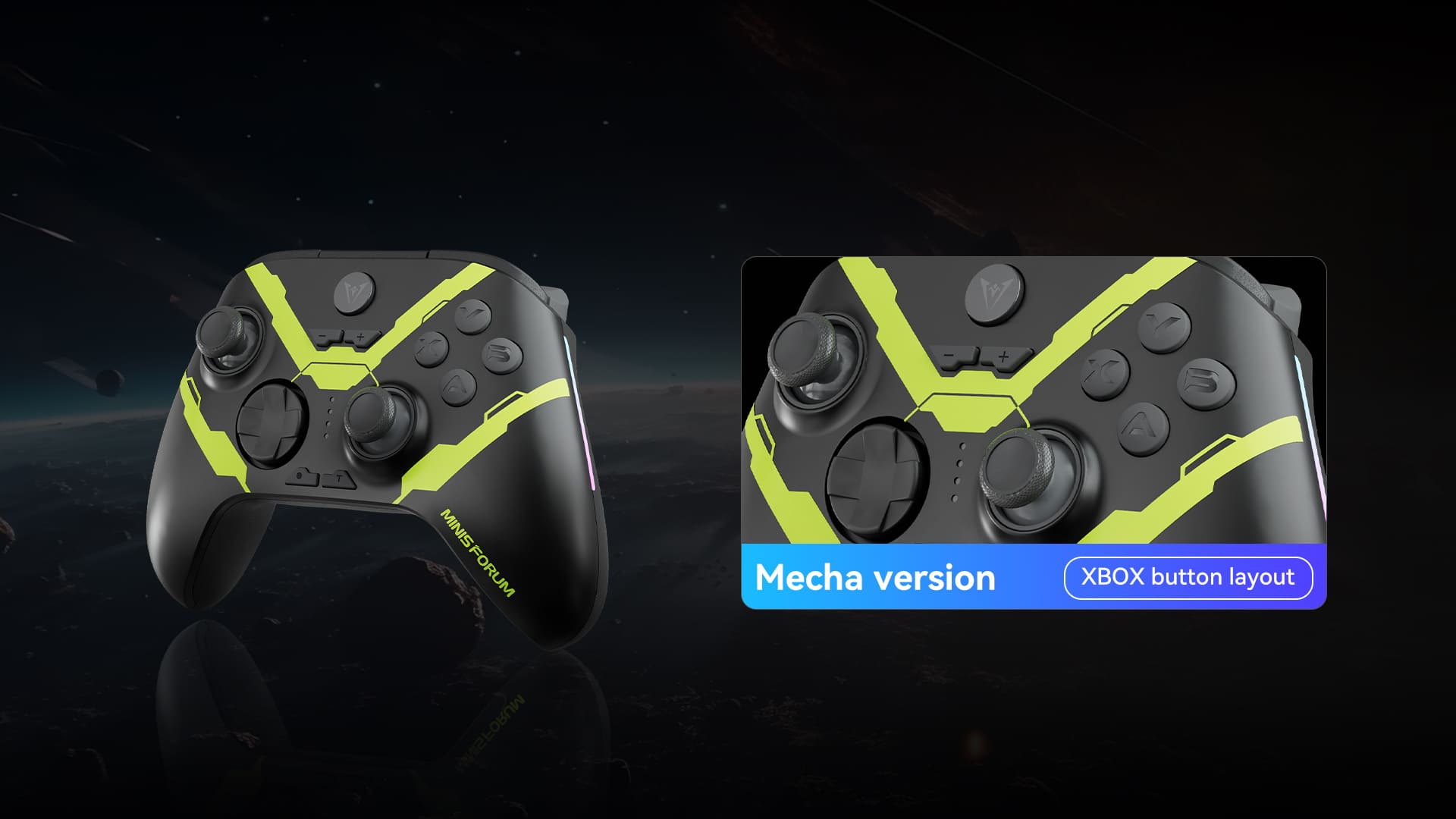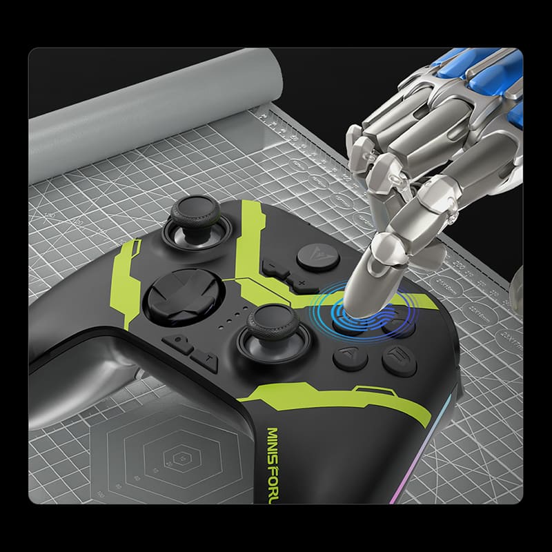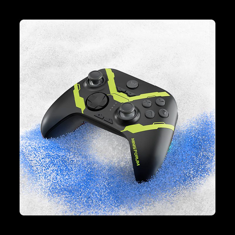 Minisforum wireless controllers are available for Windows 10, Windows 11, PC, Steam, Switch, etc., and can also be connected via a USB-A receiver. Specific controls can be configured via the app. The built-in 1000mAh lithium-ion battery lasts up to 22 hours (without lighting). Hall linear switches and ergonomic design extend the service life and ensure a comfortable gaming experience.