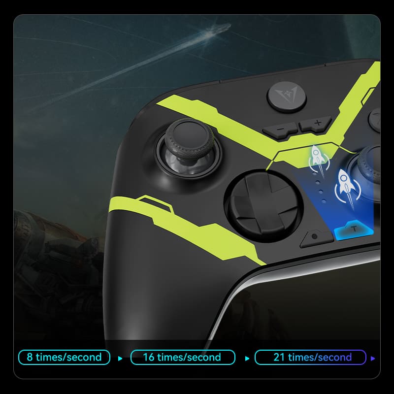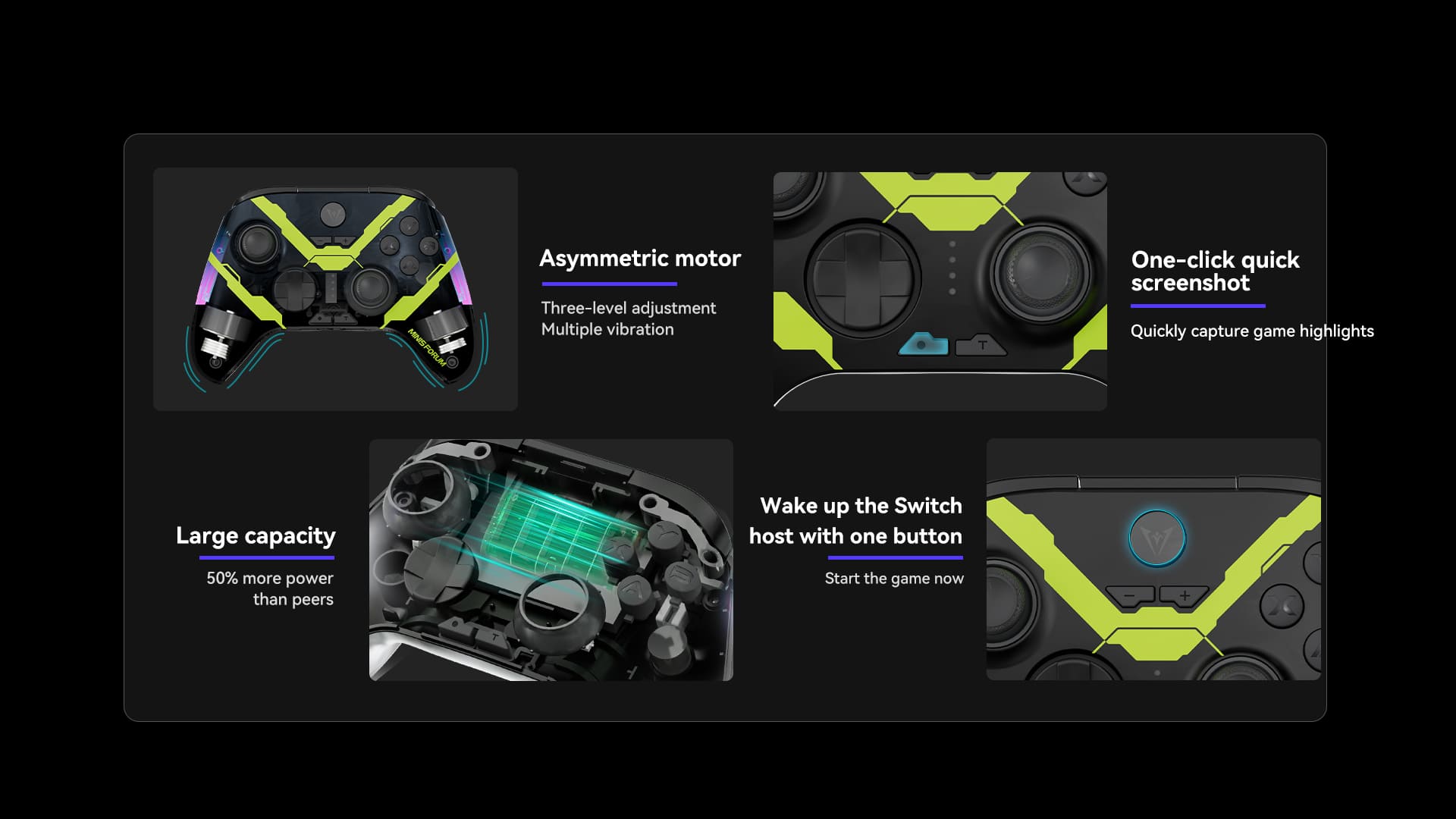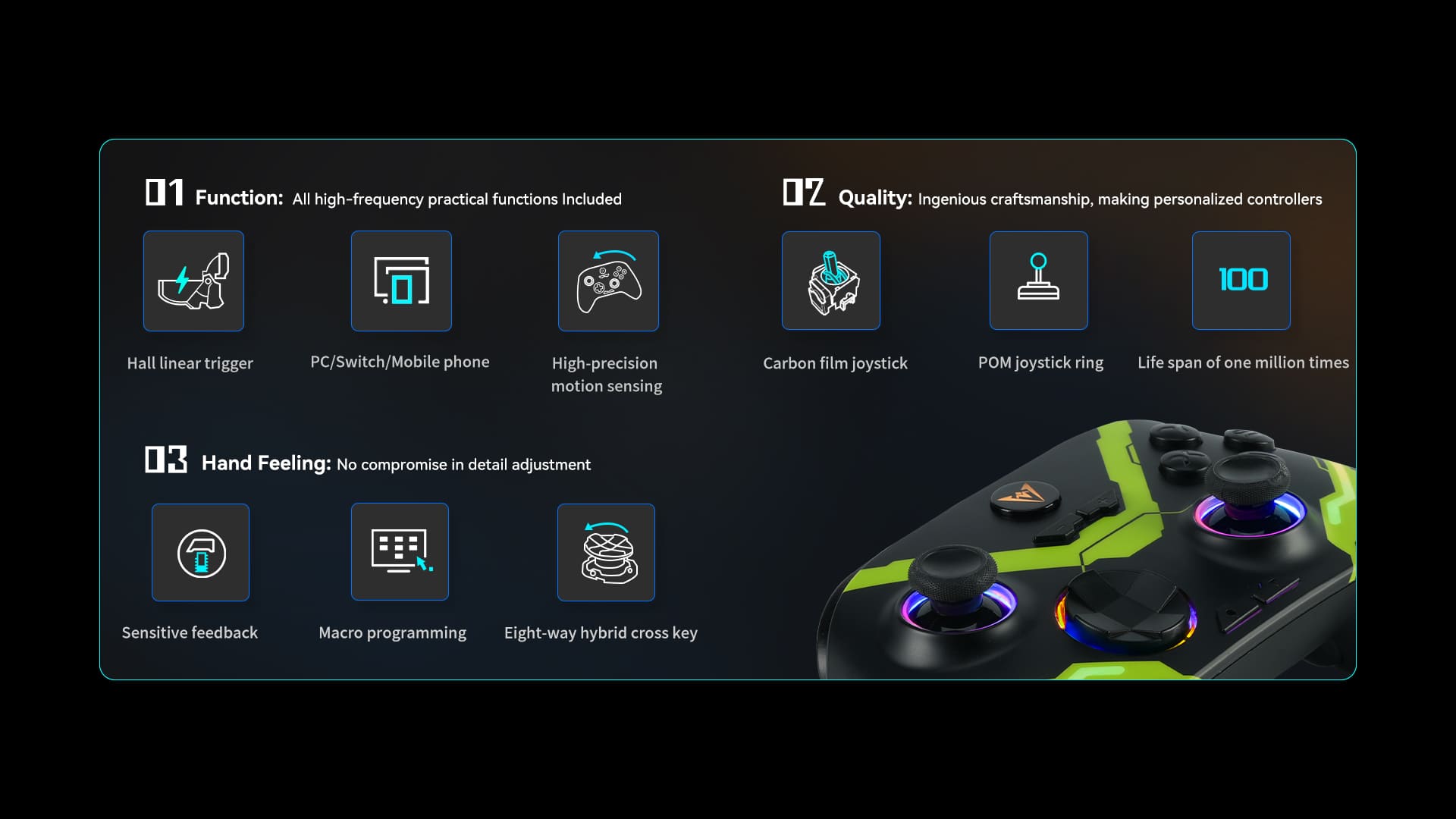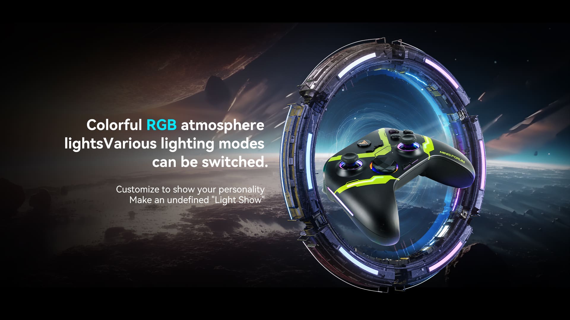 Minisforum wireless controllers are available for Windows 10, Windows 11, PC, Steam, Switch, etc., and can also be connected via a USB-A receiver. Specific controls can be configured via the app. The built-in 1000mAh lithium-ion battery lasts up to 22 hours (without lighting). Hall linear switches and ergonomic design extend the service life and ensure a comfortable gaming experience.