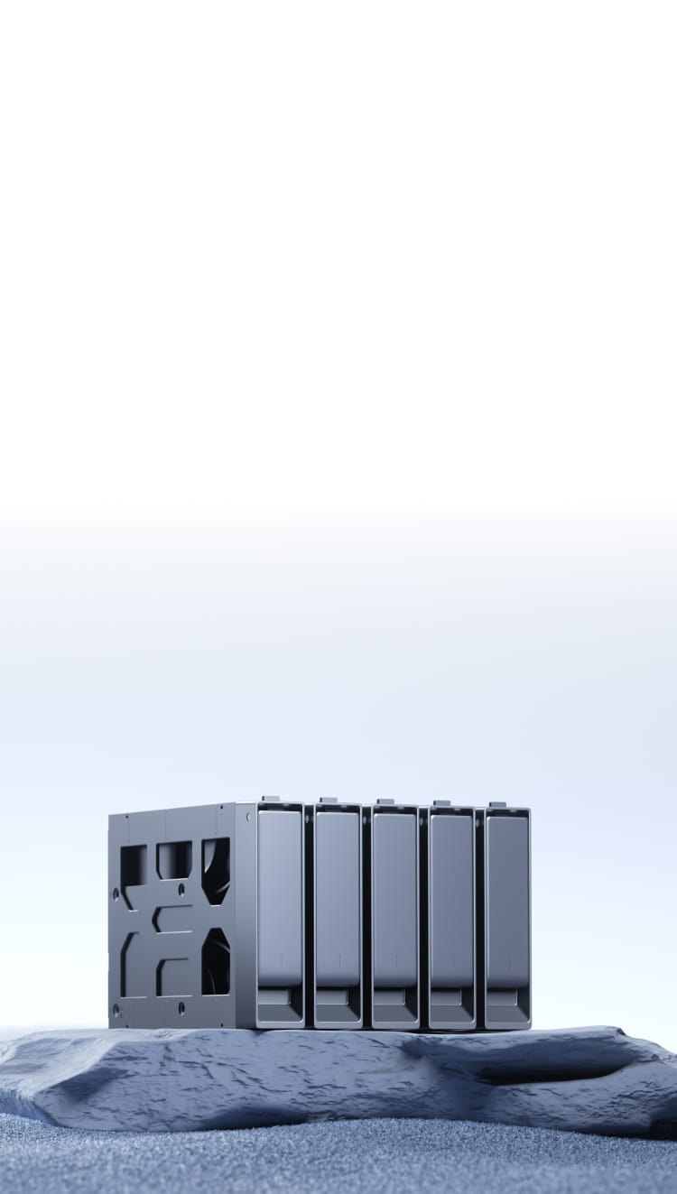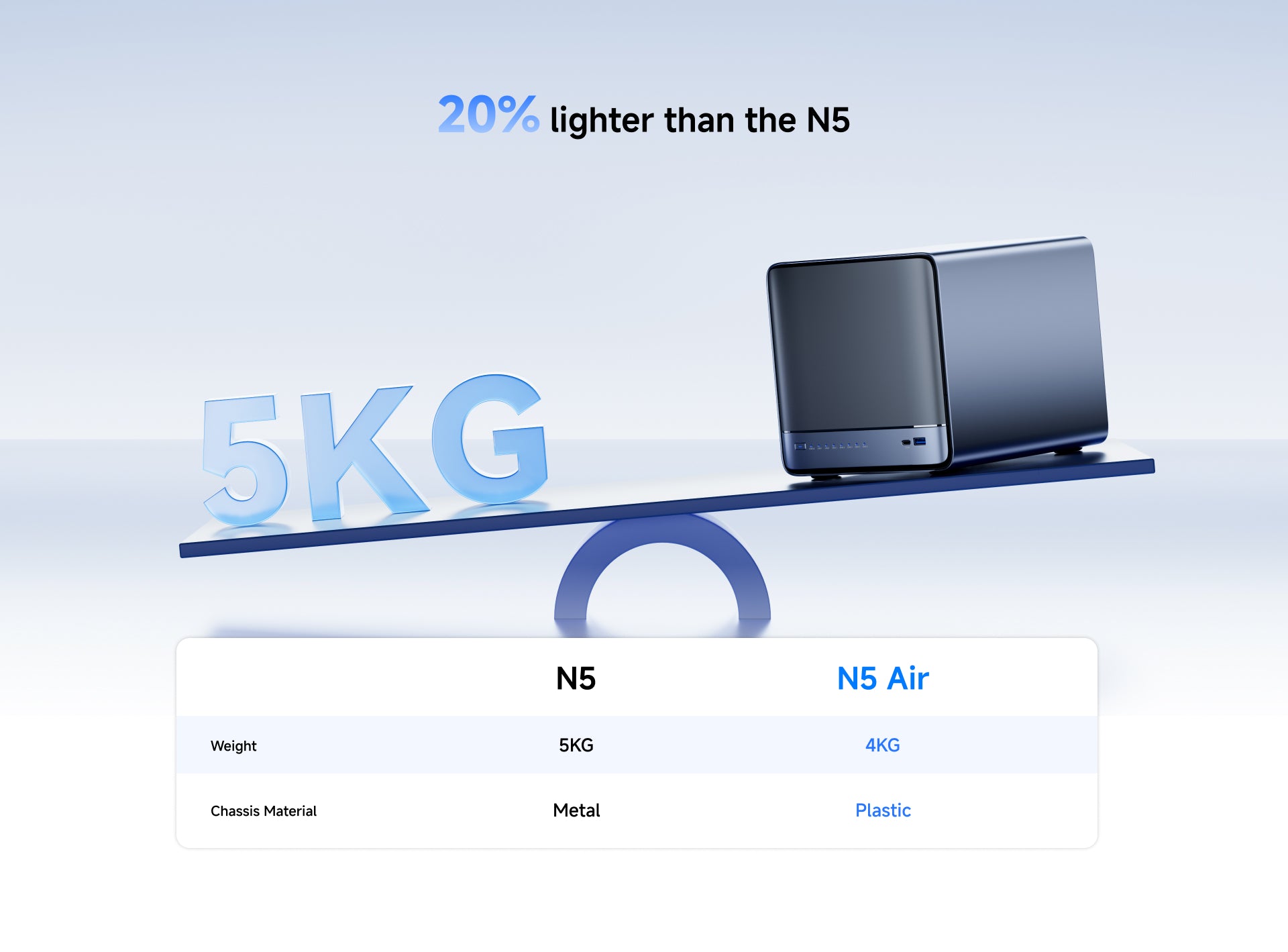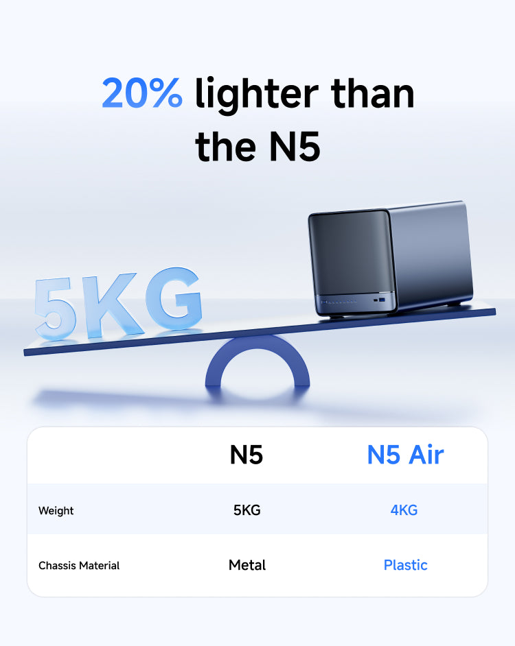 A Compact 199×202×252mm frame holds 5 drives in a 4-bay space, delivering 25% more storage.