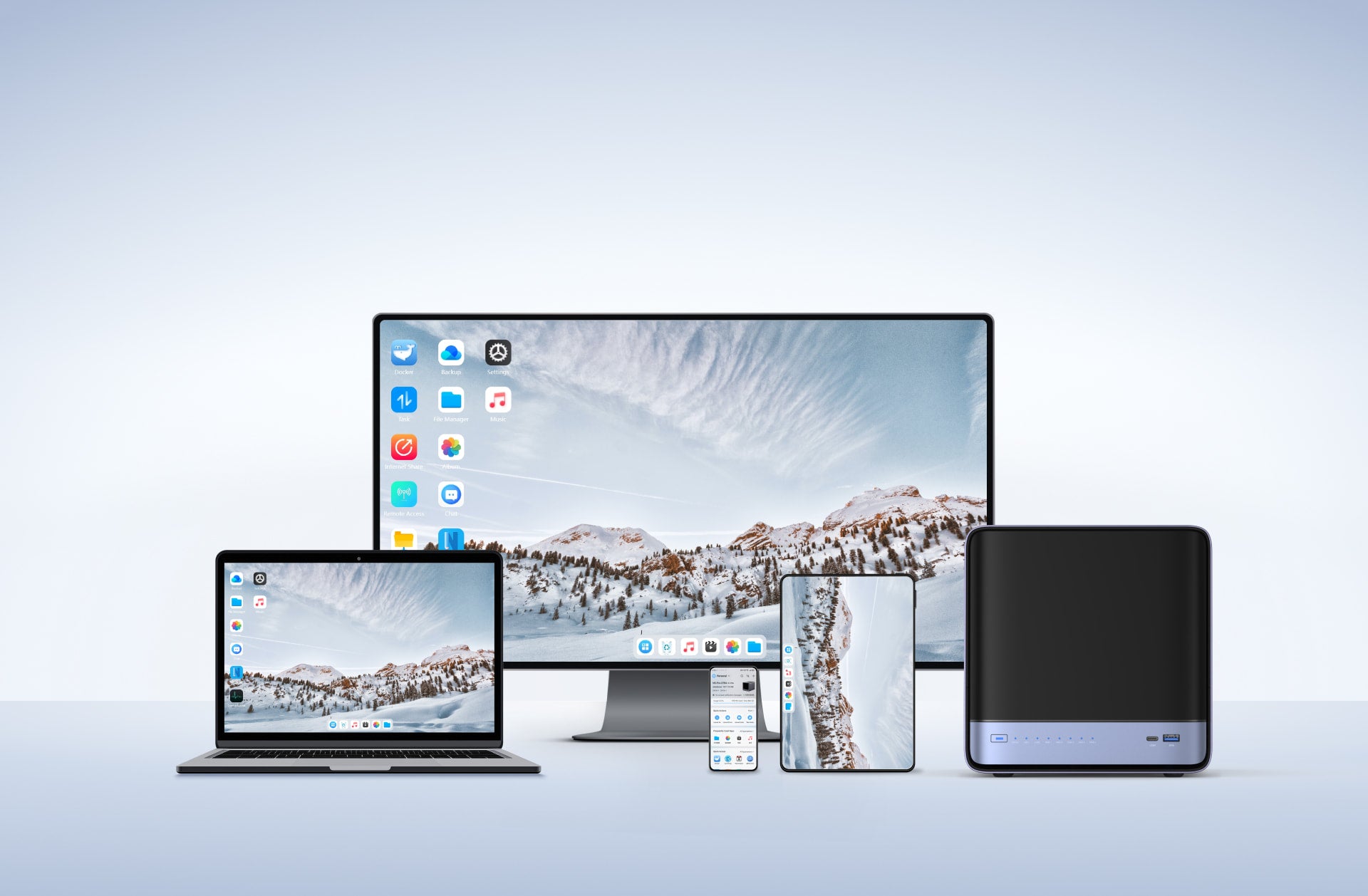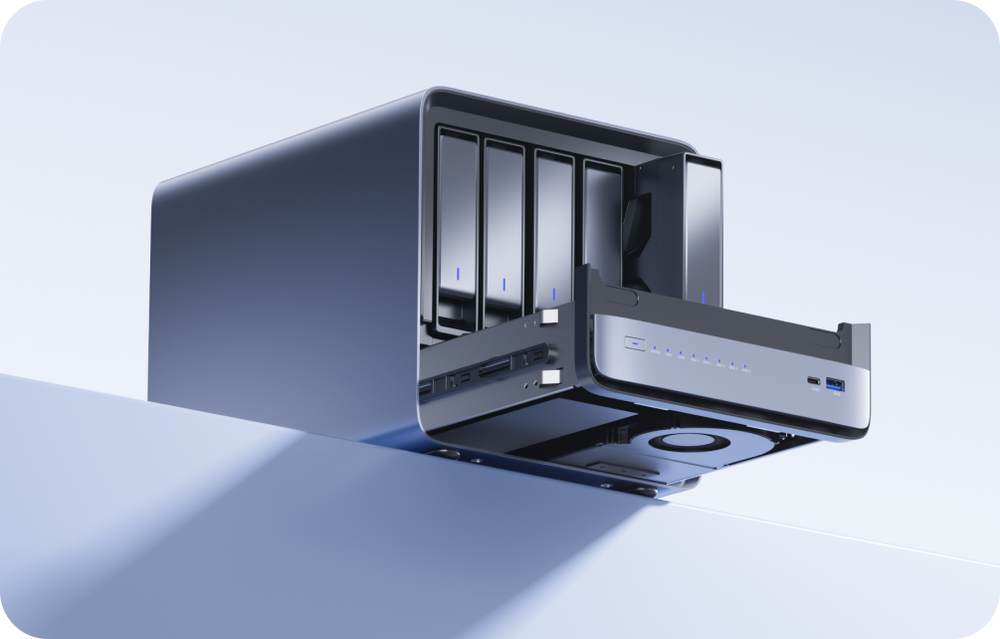 Built-in features include ZFS snapshots, LZ4 compression, multi-user isolation, Docker apps, AI photo albums, and one-click remote access-fully managed, ready to use.