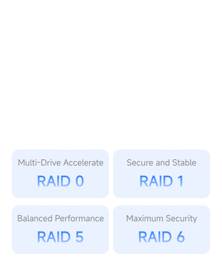 Supports RAID 0/1/5/6 with flexible storage strategies, balancing performance and security.