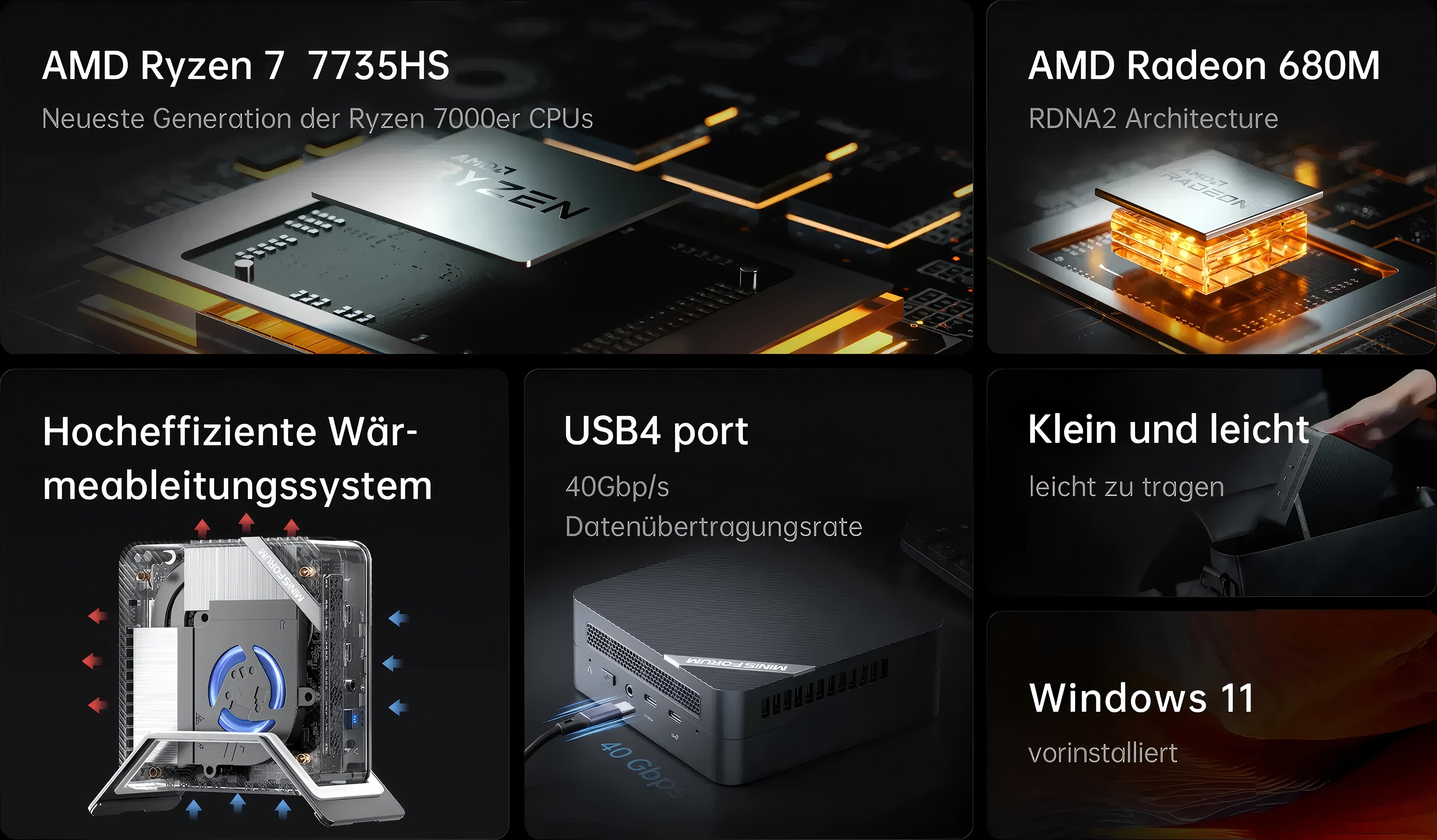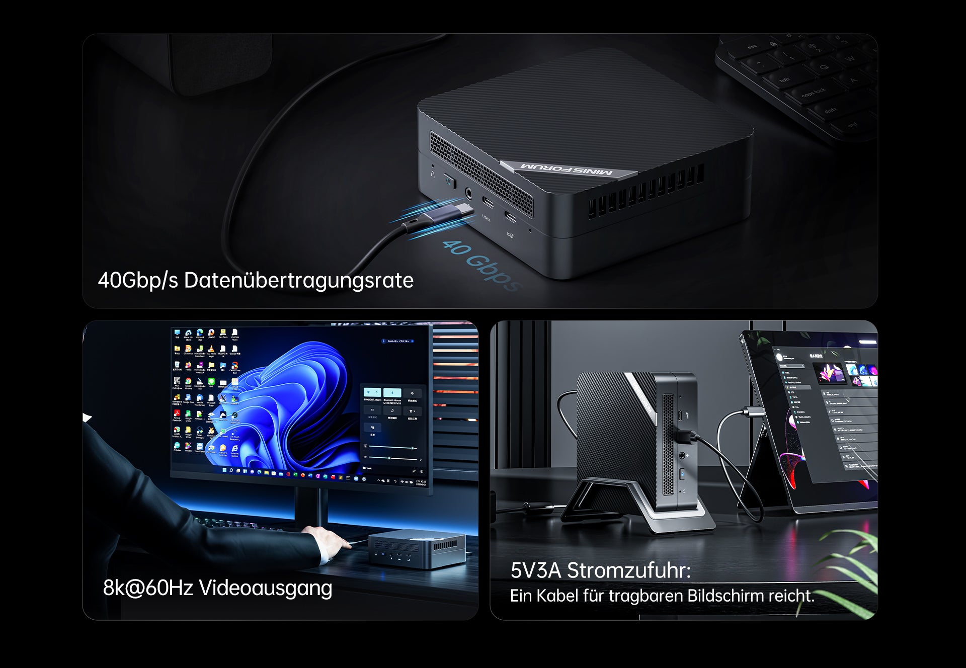 Das UM773 Lite ist mit einem voll funktionsfähigen USB4-Anschluss ausgestattet. Dieser vielseitige Anschluss bietet nicht nur eine Datenübertragungsgeschwindigkeit von bis zu 40Gbps und eine 8K@60Hz-Anzeige, sondern unterstützt auch eine 5V3A-Stromversorgung.