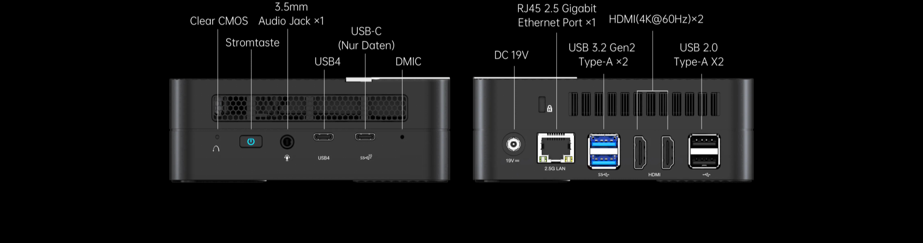 The UM773 Lite offers comprehensive connectivity in a compact package. It has one fully functional USB4 port, four USB Type-A ports, two HDMI 4K@60Hz ports and one RJ45 2.5 Gigabit Ethernet port.